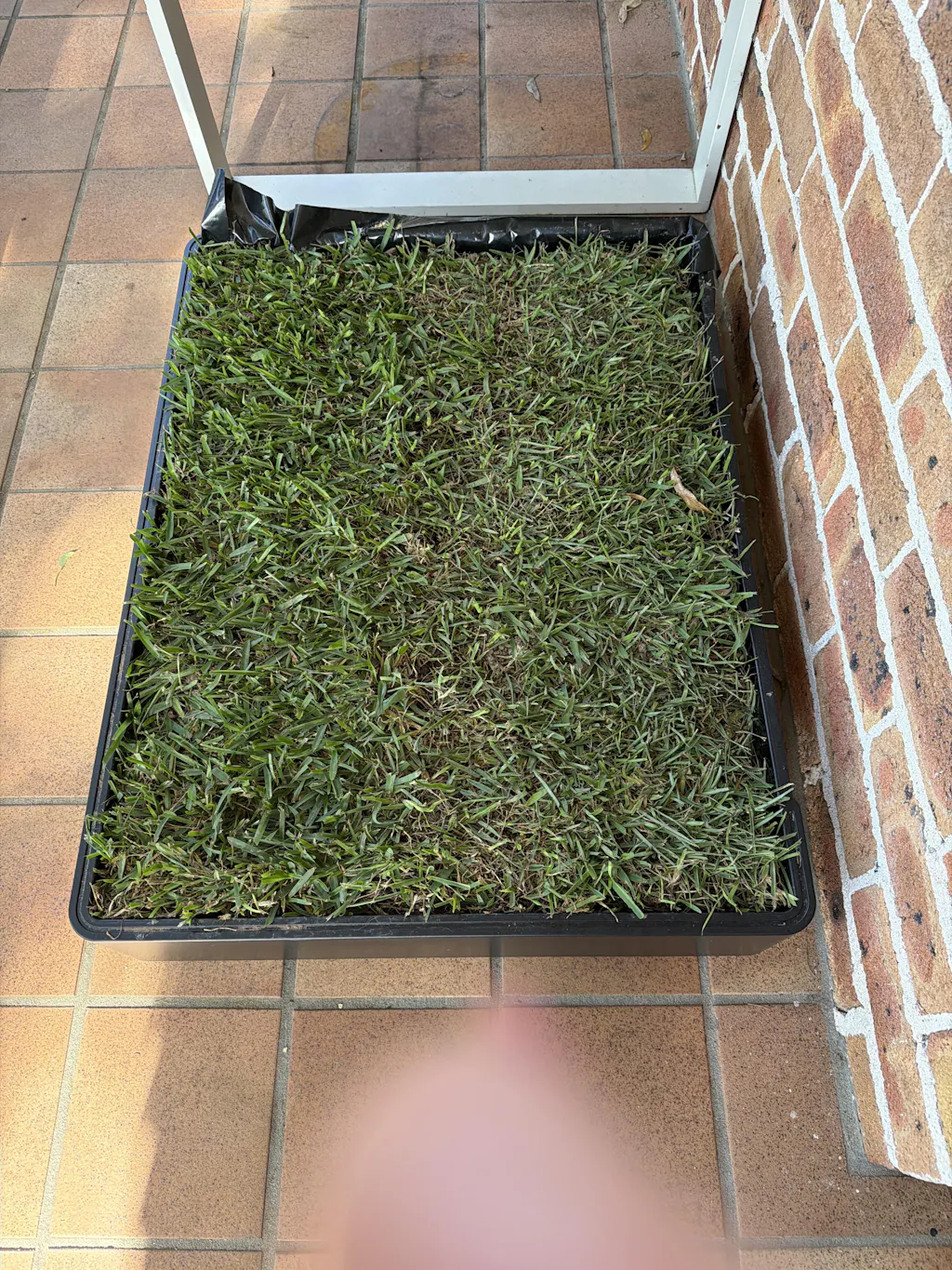 It’s also the perfect size for our cavoodle, who took to it straight away. The grass itself (purchased separately) is still holding up really well. We water it regularly, which seems to help keep it fresh.
